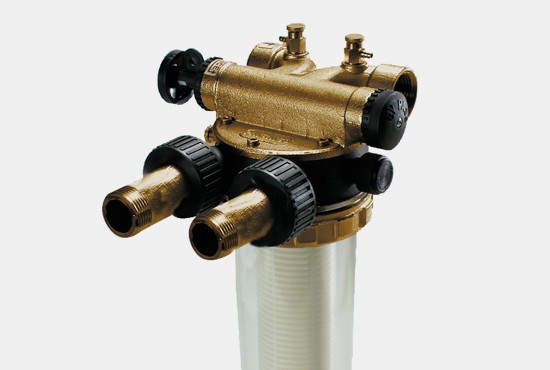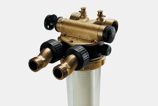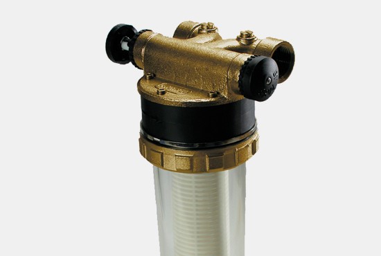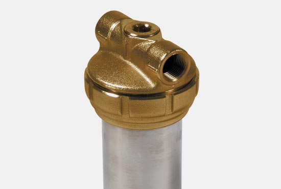 Filter with integrated by pass. Suitable for treatment of drinking water with neutral ph. Version with 1” curved fittings.