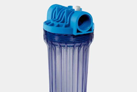 Contenitore per il trattamento di acque potabili in generale a ph neutro. Con vaso in SAN trasparente.